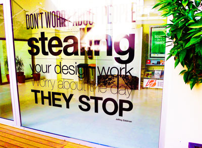 webdesigner américain Jeffrey Zeldman du studio newyorkais HAPPY COG couvre une baie vitrée de l’Institut Européen du Design de Barcelone : “Ne vous inquiétez pas qu’ils vous volent vos travaux de design. Inquiétez-vous quand ils ne le feront plus !“.