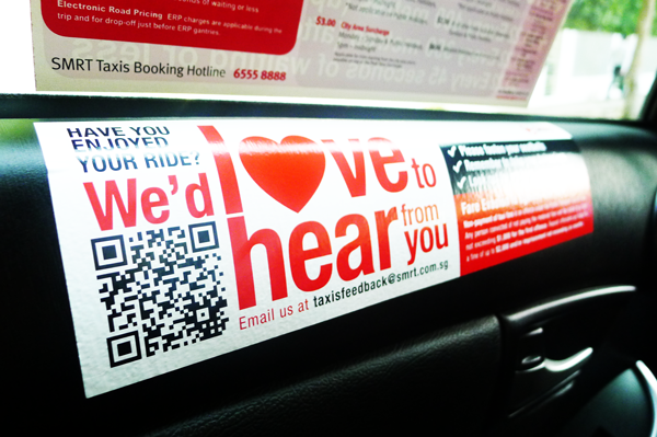 A Singapour les clients sont invités à donner un feedback sur leur course et sur le chauffeur de taxi. Comment ? Tout simplement en laissant un message sur une adresse donnée par un QRCode. Ou en envoyant un courriel à TAXIFEEDBACK@SMRT.COM.SG. Sympa et simple, non ?
