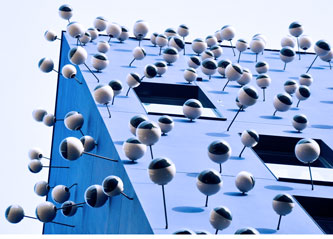La façade de l’HOTEL OHLA de Barcelone ne manque pas de créativité ni de … vision ! Conçue par l’artiste catalan multiple qu’est Frederic Amat (Barcelone, 1952), – il est entre autre peintre, sculpteur, scénographe et designer – cette création étonne par sa naïveté primesautière et effraye par la perspective orwélienne qu’elle offre. La nuit, l’éclairage de cet ensemble original enchante la rue Contal.