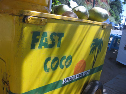 Symbole d’un certain dilettantisme et laisser-aller, la noix de coco et son précieux jus blanc sont ici – sur la plage de Buzios à 3 heures de route de Rio de Janeiro – happés par notre société de la vitesse : l’échoppe devient « Fast Coco ». Laissons-nous vivre et préférons en vacances le « Slow coco » …
