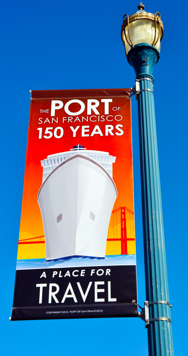 Belle illustration graphique d’inspiration Art Déco pour illustrer les 150 ans du port de San Francisco. Pour les Autorités locales, la renaissance du port de la ville est à l’image de la Renaissance que connaîtrait actuellement la ville natale de Jack London. Ceci est une illustration parmi une dizaine, plus belles les unes que les autres.
