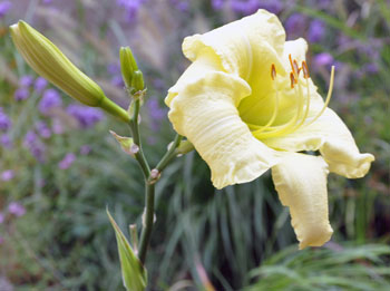 Photo prise ce matin vers 10h30 dans le petit patio de mon loft à Barcelone : une belle hemerocalle jaune s’est épanouie parmi les verveines violacées de Buenos Aires.